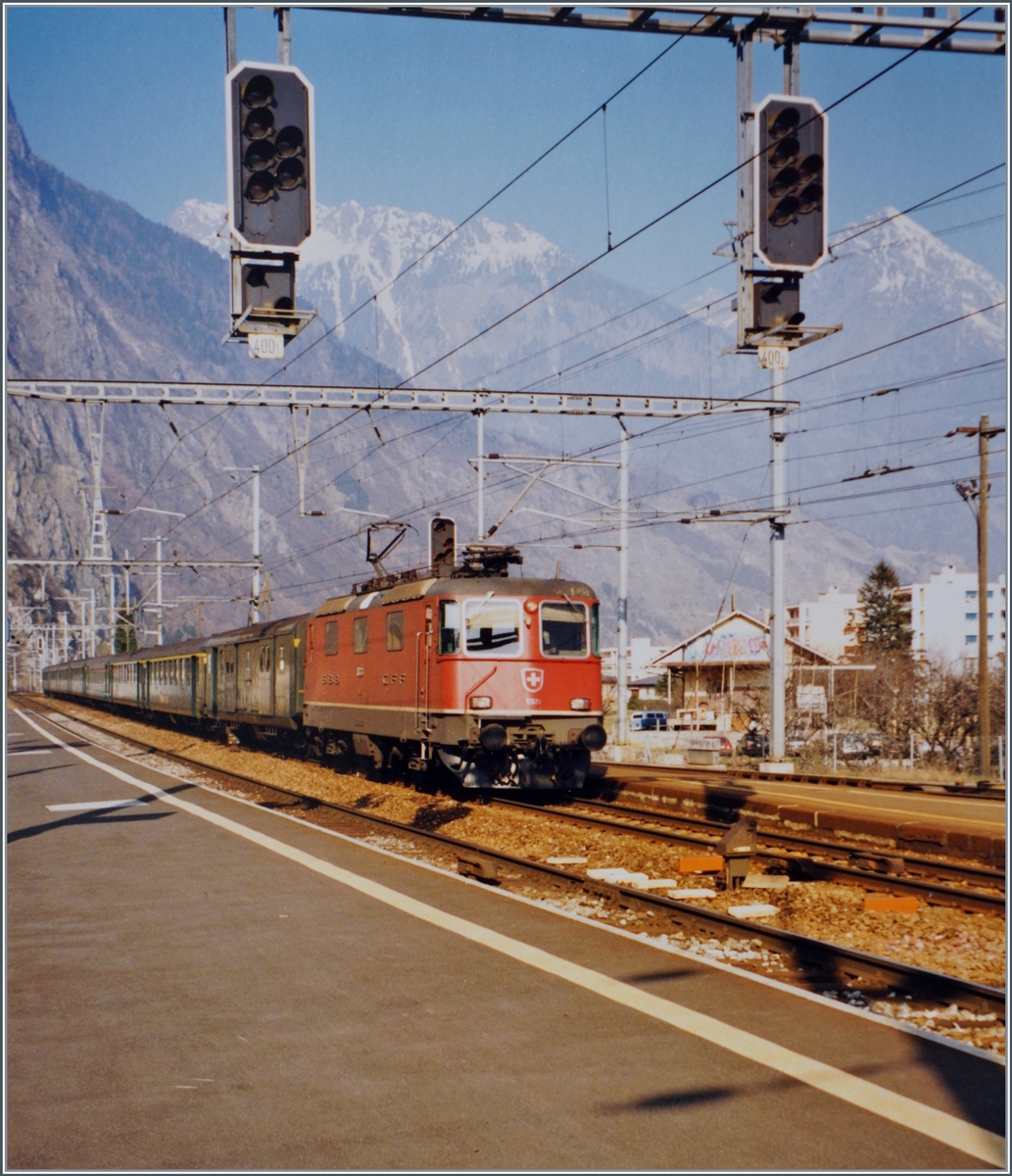 Re 4/4 II 11218 mit Entlastungs EC 30139 in Brig. Der Zug hat aktuell eine Verspätung von 20 Min. Er kam zwischen Visp und Brig zu Stillstand, dies wegen eines Problems im Bahnhof Brig, 02.01.2012.