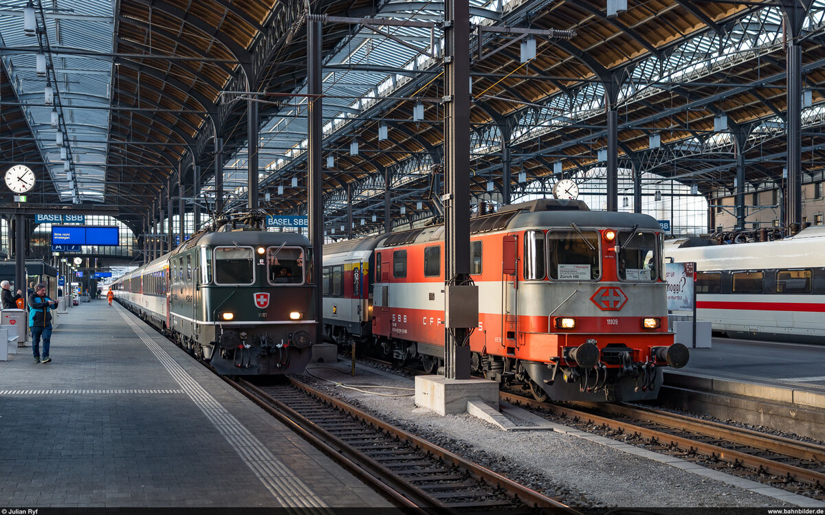 Die rote Re 4/4 Nr. 11223 bringt den Zug den Berg herauf. Vom Bahnsteig