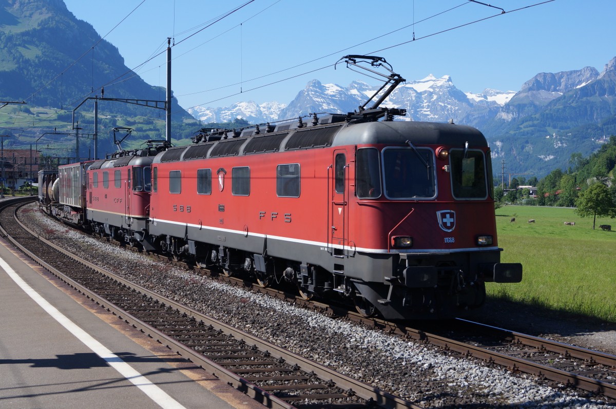 SBB CARGO: Re 6/6 11668 "Stein Säckingen" vor der Kulisse der Urner Berge am 7. Juni 2014 in Schwyz.