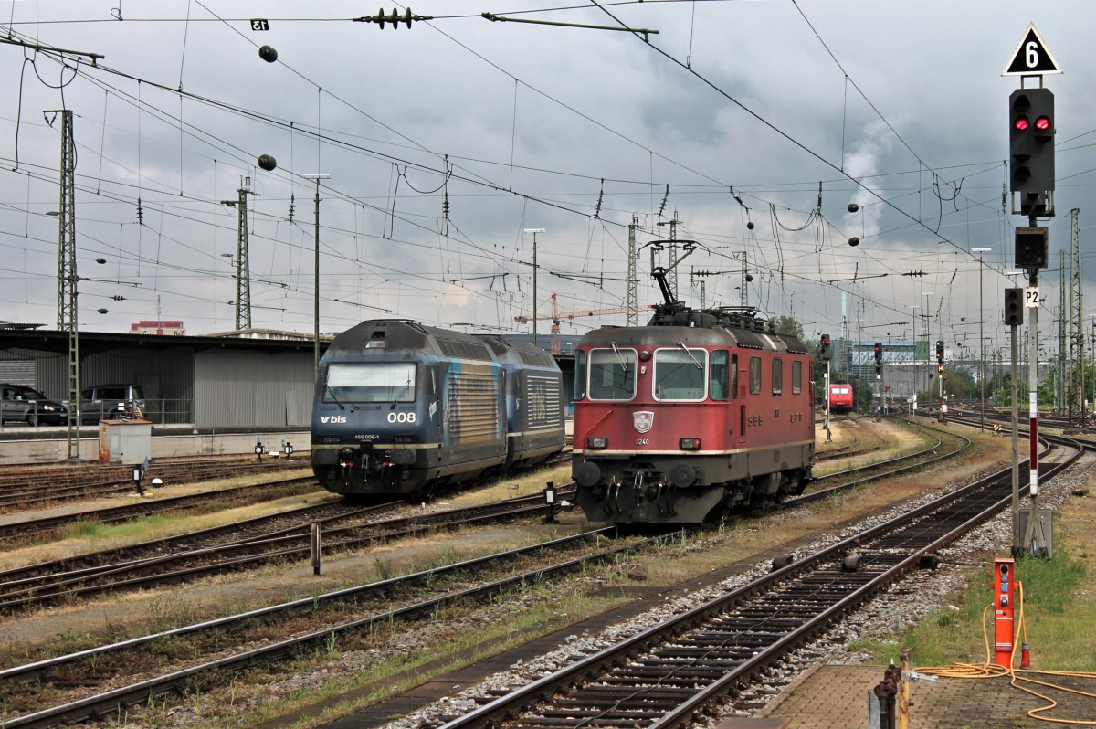 Nachschuss auf SBB CFF FFS Re 4/4 11240, als sie als Lokzug die BLS Cargo Loks Re 465 008-1 "GoldenPassLine" und Re 465 014-9 im Badischen Bahnhof von Basel passiert.