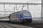 Re 4/4 II 11155 durchfährt bei leichtem Schneefall den Bahnhof Muttenz. Die Aufnahme stammt vom 26.01.2015.