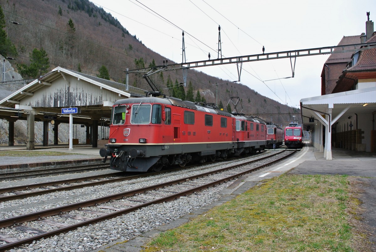 Die beiden SBB Re 4/4 II 11200 und 11125 stehen tagsüber in Vallorbe und warten auf den Nachtzug Frankreich-Italien, 25.03.2015.