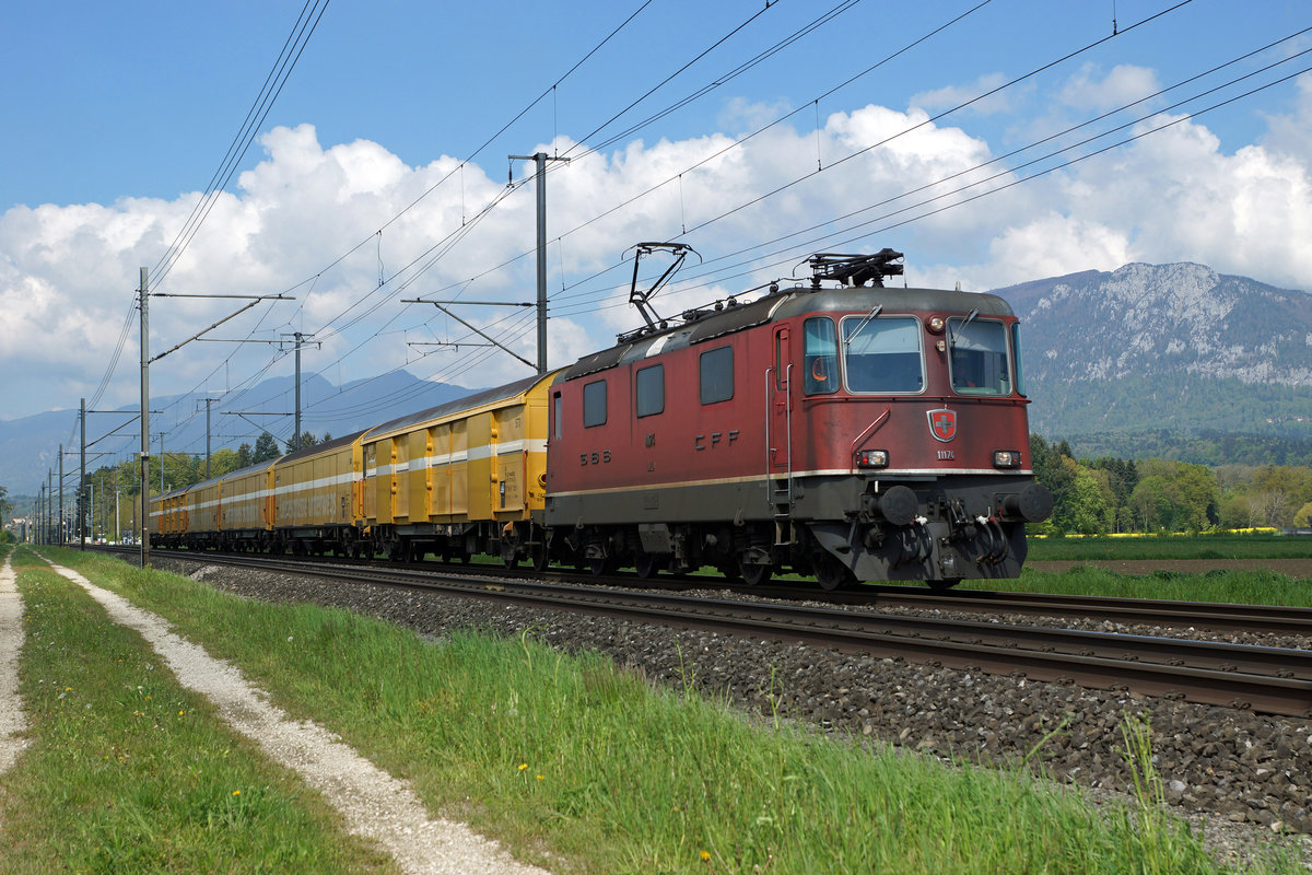 SBB: Der Postzug von Simon Bütikofer mit der Re 4/4 II 11174 (noch ohne die grosse weisse Nummer) bei Deitingen am 4. Mai 2016 auf voller Fahrt mit dem Endziel Härkingen.