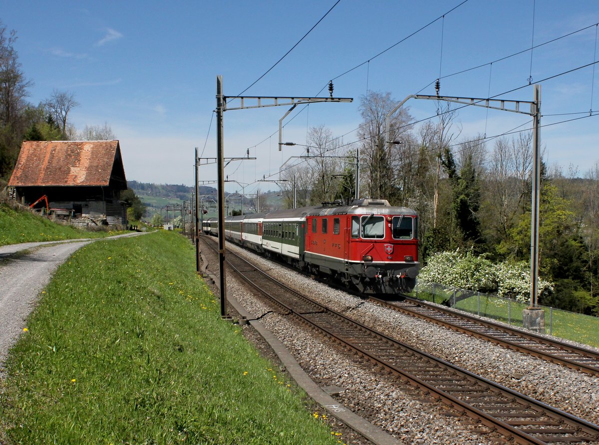 Die Re 4/4 11154 mit einem IR am 26.04.2012 unterwegs bei Immensee.