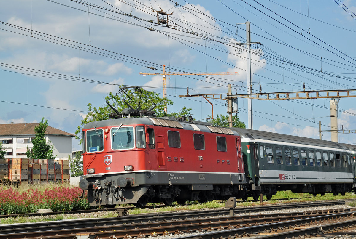 Re 4/4 II 11138 durchfährt den Bahnhof Pratteln. Die Aufnahme stammt vom 06.06.2016.