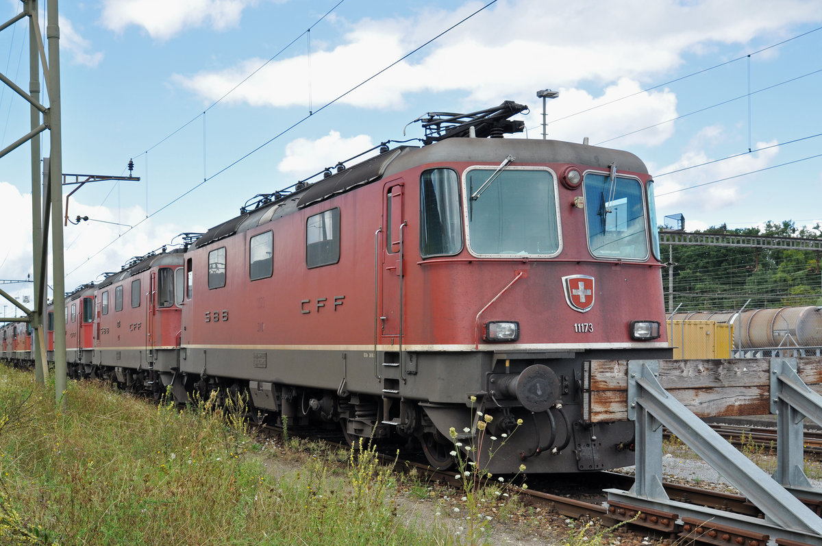 Re 4/4 II 11173 ist beim Güterbahnhof Muttenz abgestellt. Die Aufnahme stammt vom 21.08.2016.