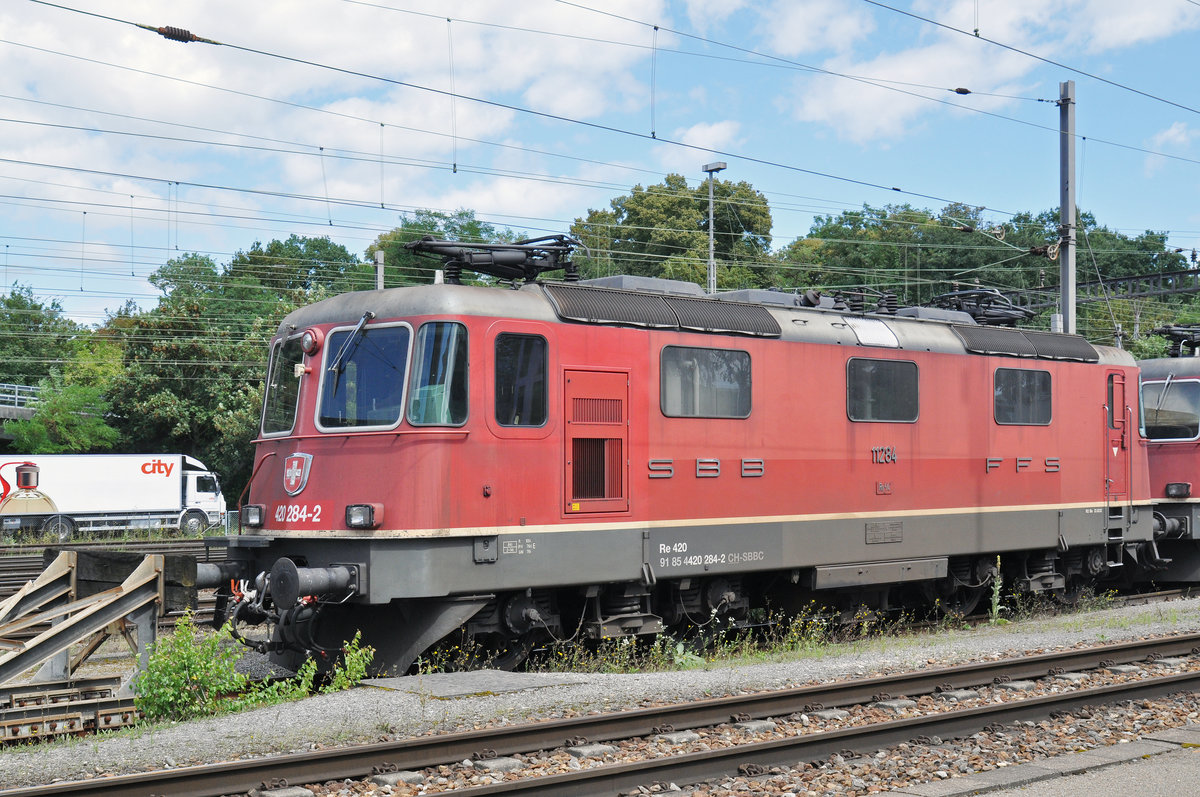 Re 4/4 II 11284 ist beim Güterbahnhof Muttenz abgestellt. Die Aufnahme stammt vom 21.08.2016.