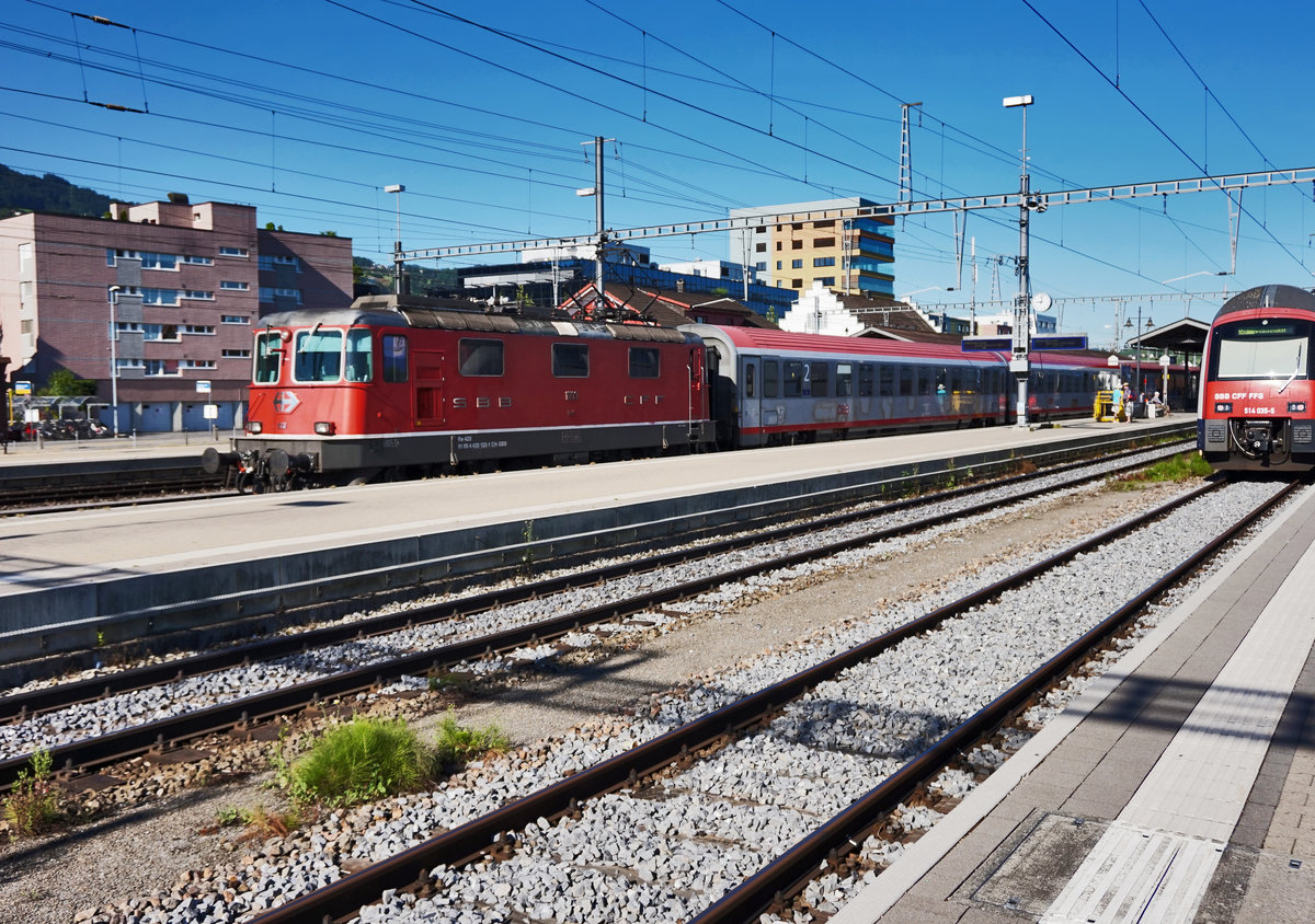 Re 4/4 II 11133 durchfährt mit dem EC 163 "Transalpin" (Zürich HB - Graz Hbf), den Bahnhof Pfäffikon SZ.