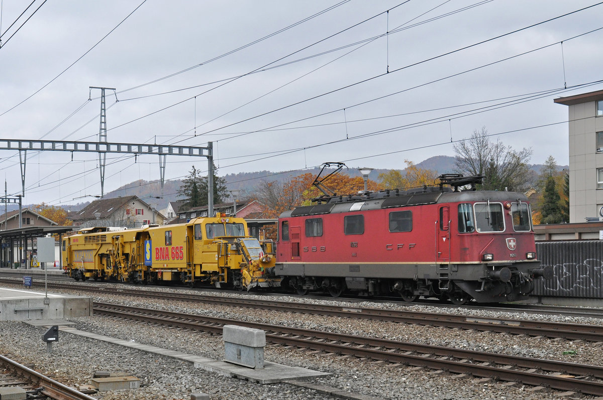 Re 4/4 II 11262 durchfährt mit der Universalstopfmaschiene 80 85 95 81 921-6 von Scheuzer den Bahnhof Sissach. Die Aufnahme stammt vom 30.10.2015.