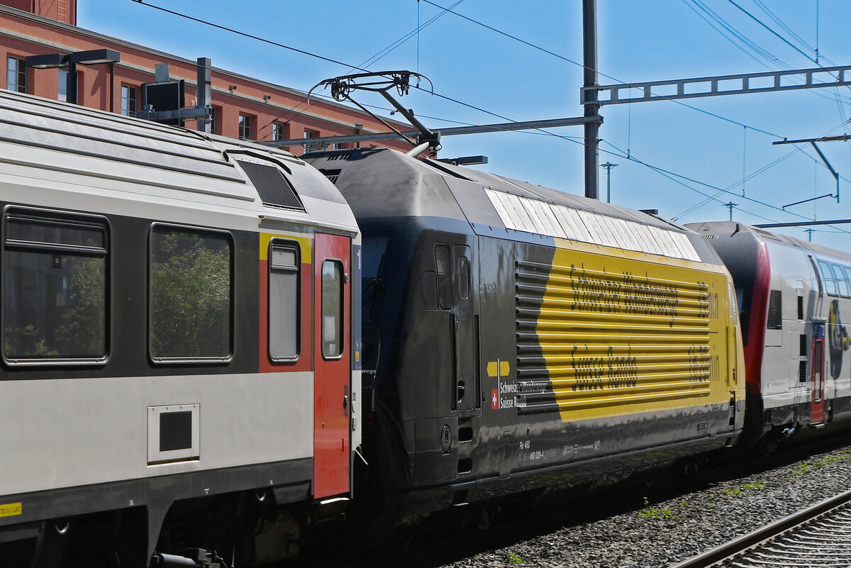 421 379-9 macht auf die neuen schnellen Verbindungen nach München aufmerksam. Das wird nach Ende der Elektrifizierung in Deutschland hoffentlich der Fall sein. Chur Gbf (04.06.2020)