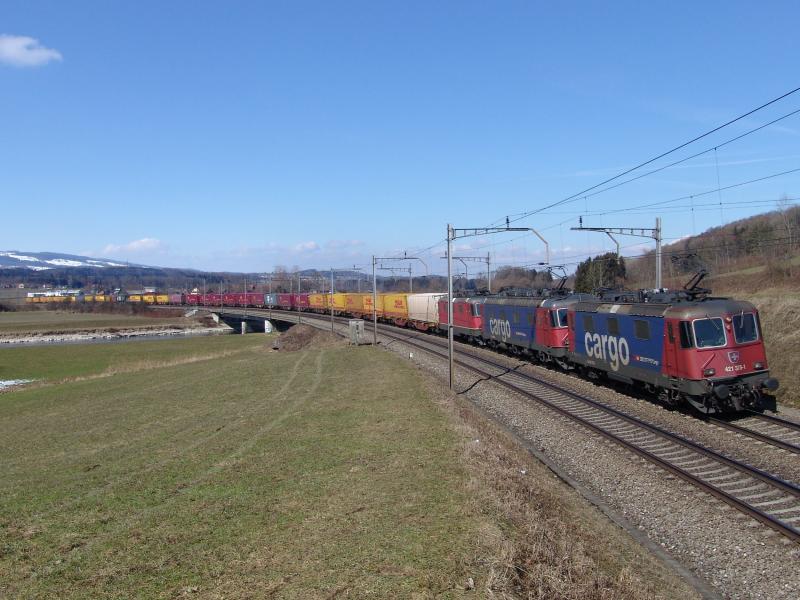 Zwei Loks mit dem Cargo Design ist genau so selten wie eine grüne Re 10/10. Aber selten heisst nicht, dass es nicht unmöglich ist, deswegen war am 13.3.05 die Re 421 378-1, Re 620 060-4 und noch eine Re 4/4 auf dem Weg ins Tessin. Hier auf dem Streckenabschnitt Oberrüti ? Rotkreuz
