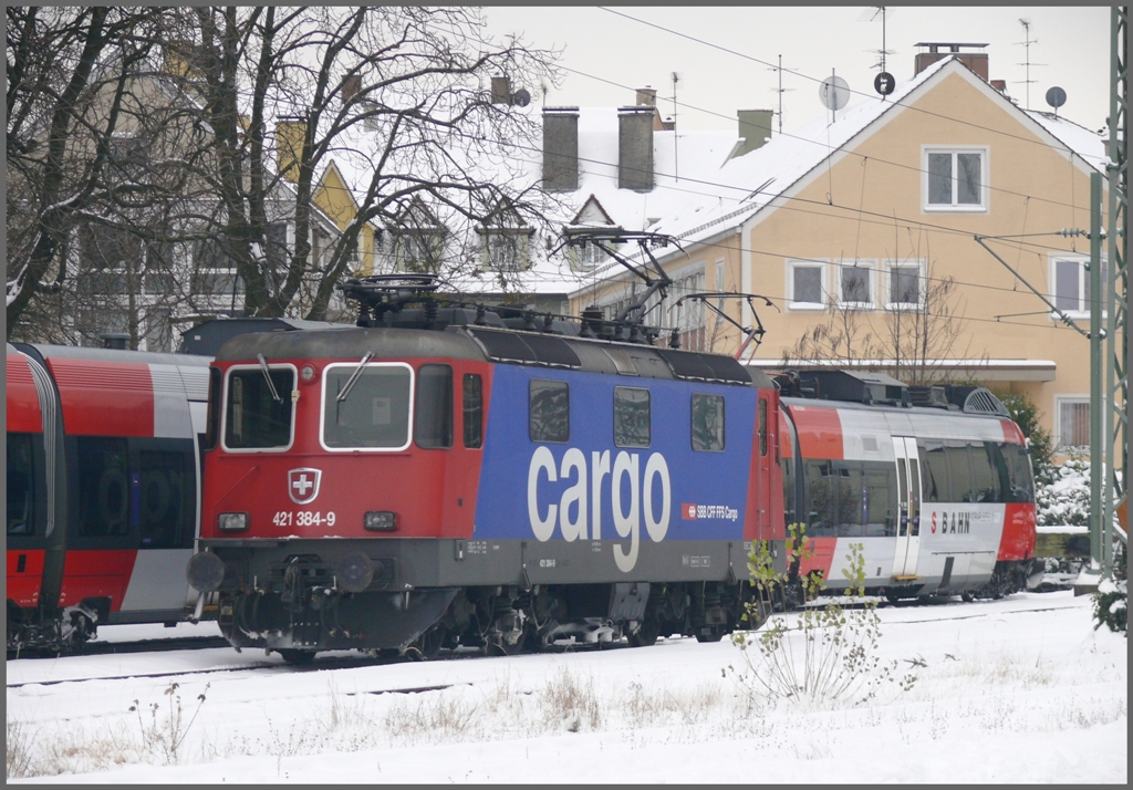 ÖBB und SBB teilen sich die elektrische Zugstraktion im sonst nur mit Dieseltraktion erreichbaren Lindau. 421 384-9 wartet im Abstellgleis auf die Rückleistung nach Zürich, (02.12.2010)