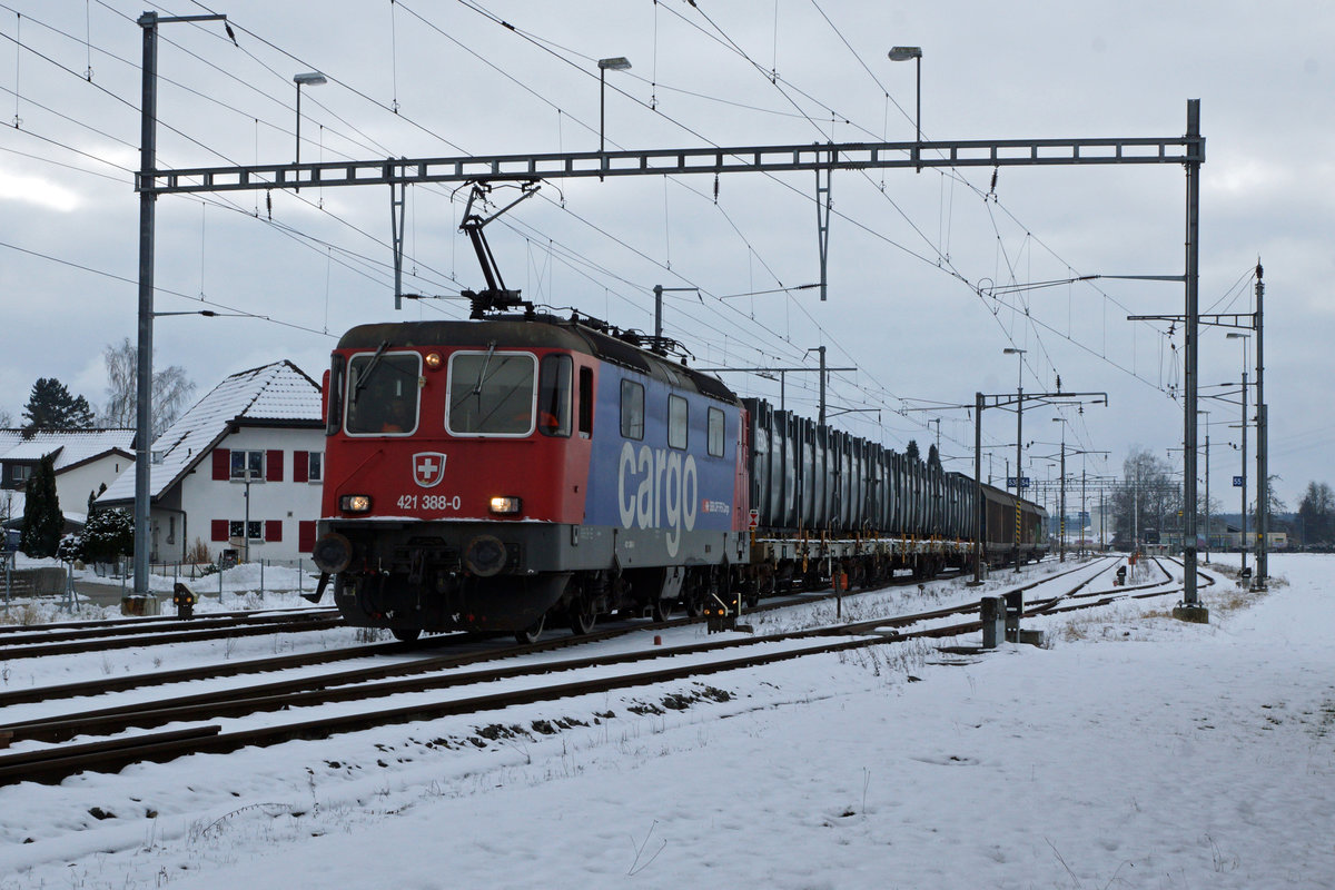 SBB: Der direkte Güterzug Wiler-Solothurn mit den Schlackenwagen von Oberburg und der Abfuhr der Papierfabrik Utzenstorf AG mit der Re 421 388-0 wartete am 16. Januar 2017 in Biberist eine Zugskreuzung mit der S44 nach Thun ab.