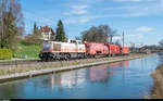 Re 430 112 ist seit kurzem im Besitz von WRS, trägt derzeit aber noch die Crossrail-Lackierung und Anschriften. Am 23. März 2017 bringt die Lok einen Getreidezug aus Ungarn nach Weinfelden. Aufgenommen am Kanal bei Bürglen TG.