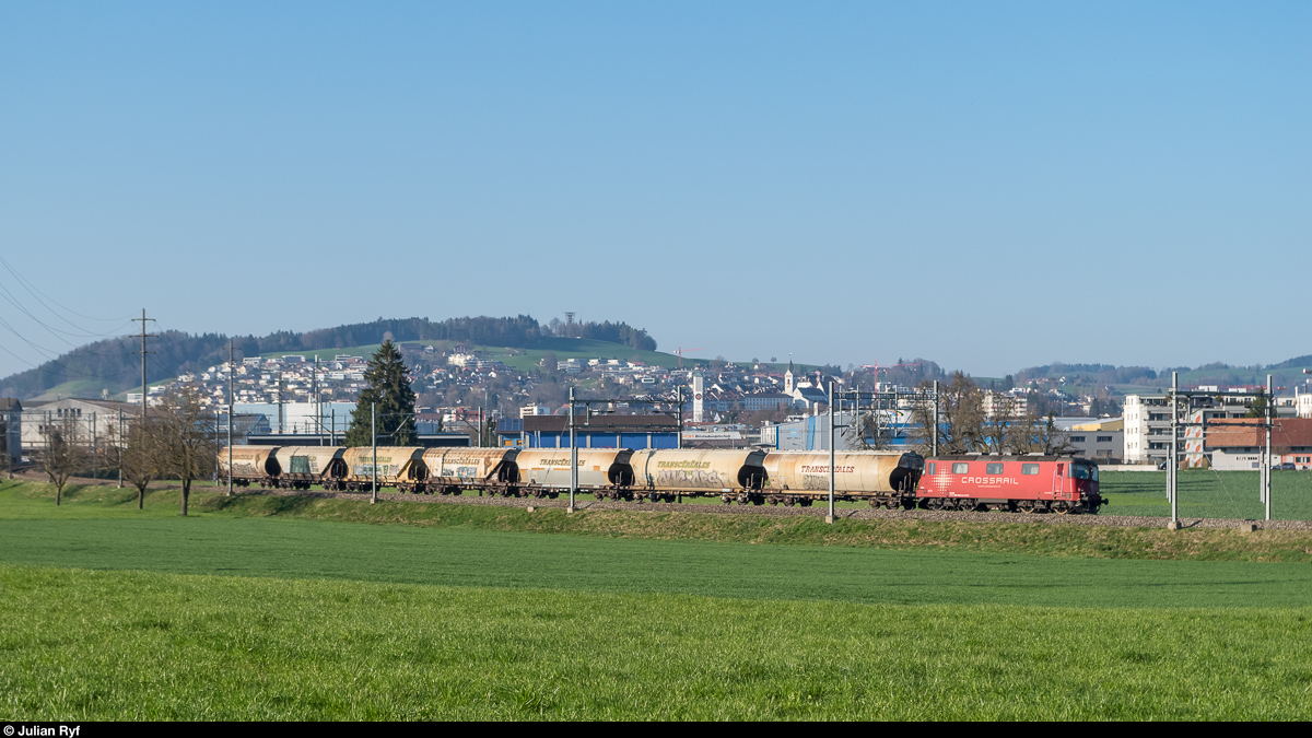 Die WRS Re 430 112 (ex Crossrail) fährt am 27. März 2017 mit einem Getreideleerzug Ausgangs Wil SG in Richtung St. Margrethen, von wo die Wagen dann wieder zurück in den Osten gehen.