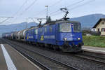 Re 430 112-3 der WRS durchfährt den Bahnhof Pratteln.