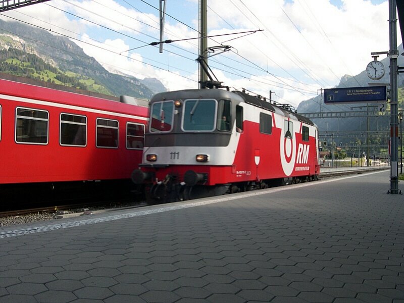 Berner Oberland 2007 - Nur mal die "Räder vertreten" wollte sich am 12.07.2007 die RM Re 4/4 436 111-9 als sie in Frutigen einem "RM-Kollegen" begegnet. Meist stand die Lok in Spiez abgestellt in einem Stumpfgleis. Sie wird als Schublok für Crossrail-Züge auf der Lötschberg-Nordrampe verwendet.