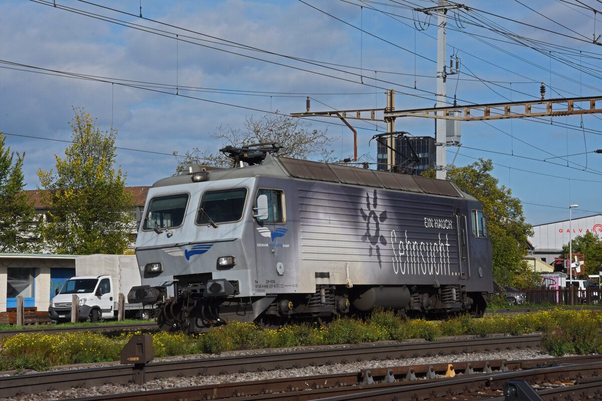 Re 446 015 am 22.6.21 in Basel Badischer Bahnhof mit leeren Flachwagen