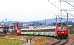 Re 456 095 zieht einen historischen Leermaterialzug aus Oensingen durch Pieterlen Richtung Biel. 24.10.2024