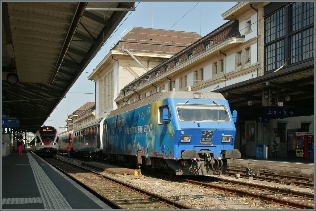Einmal mehr war das Gleis 2 in Lausanne für eine Überraschung gut: Die SOB 456 143 wartet mit zwei Reise-/Messwagen auf die Weiterfahrt.