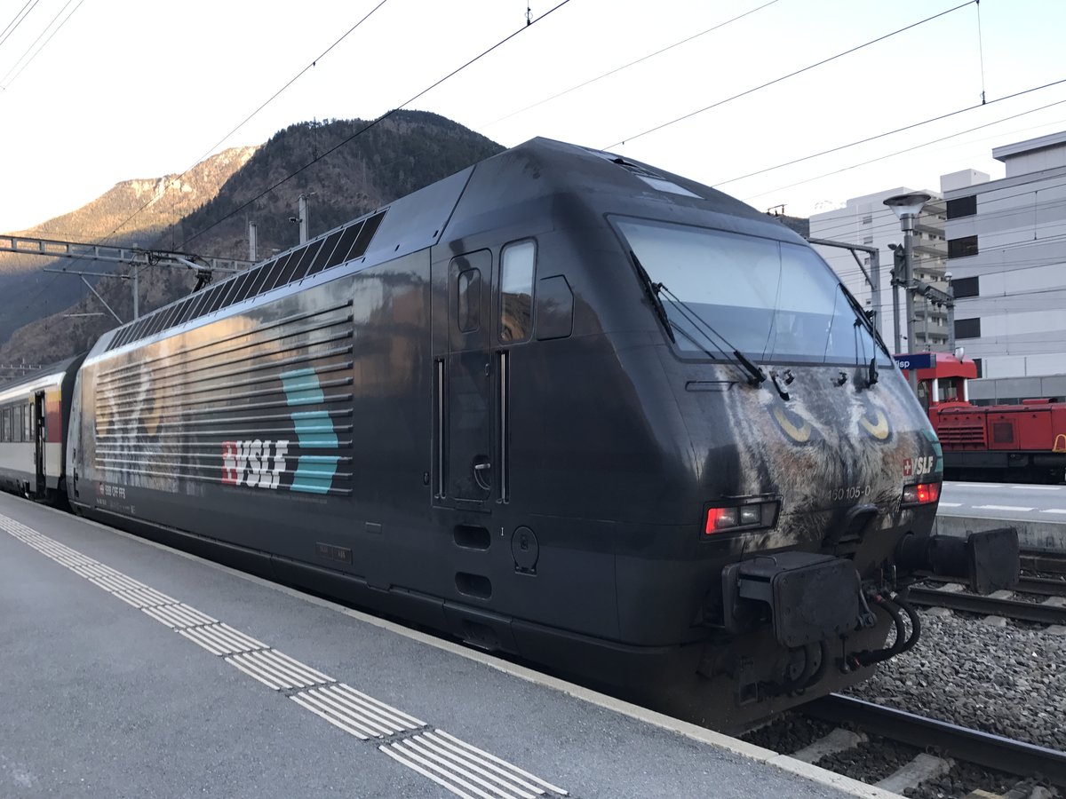 Die Re 460 105 mit der VSLF Werbung am Zusatzmodul des IC 824 von Romanshorn nach Brig, am 16.3.17 in Visp.