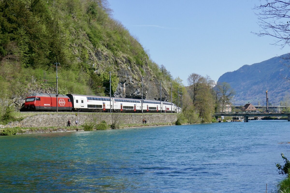Eine Re 460 stösst ihren IC 2000 zu seinem Ziel Interlaken Ost, am 11.4.26 kurz vor Interlaken Ost.