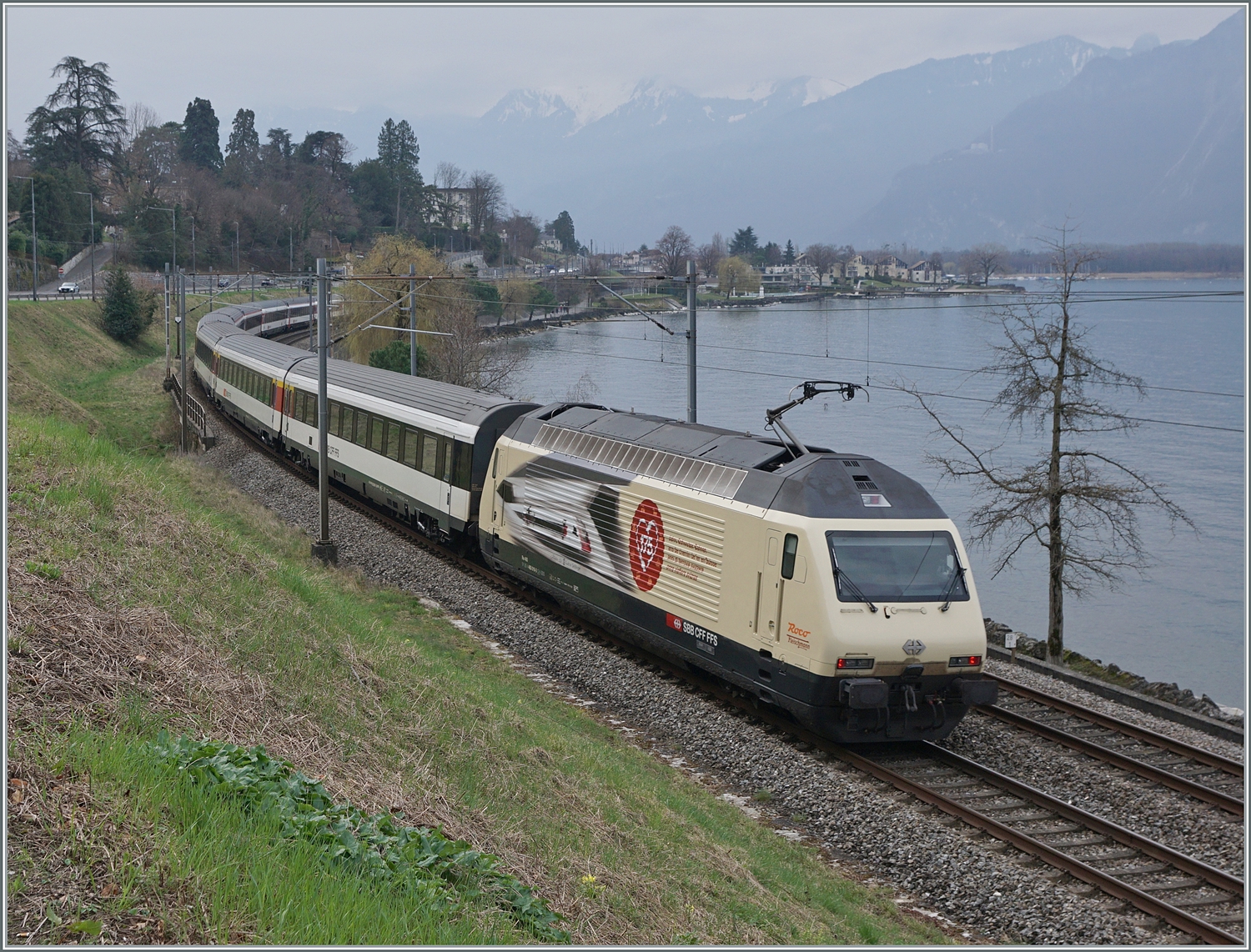 Die für „175 Jahre Schweizer Bahnen“ werbende SBB 460 019 schiebt den IR 90 1815 bei Villeneuve in Richtung Brig.