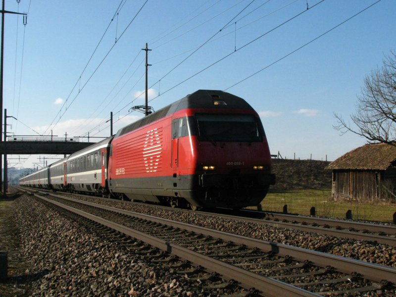 Die Re 460 058 war am 16.03.2009 mit ihrem IR nach Chur bei Bilten unterwegs.