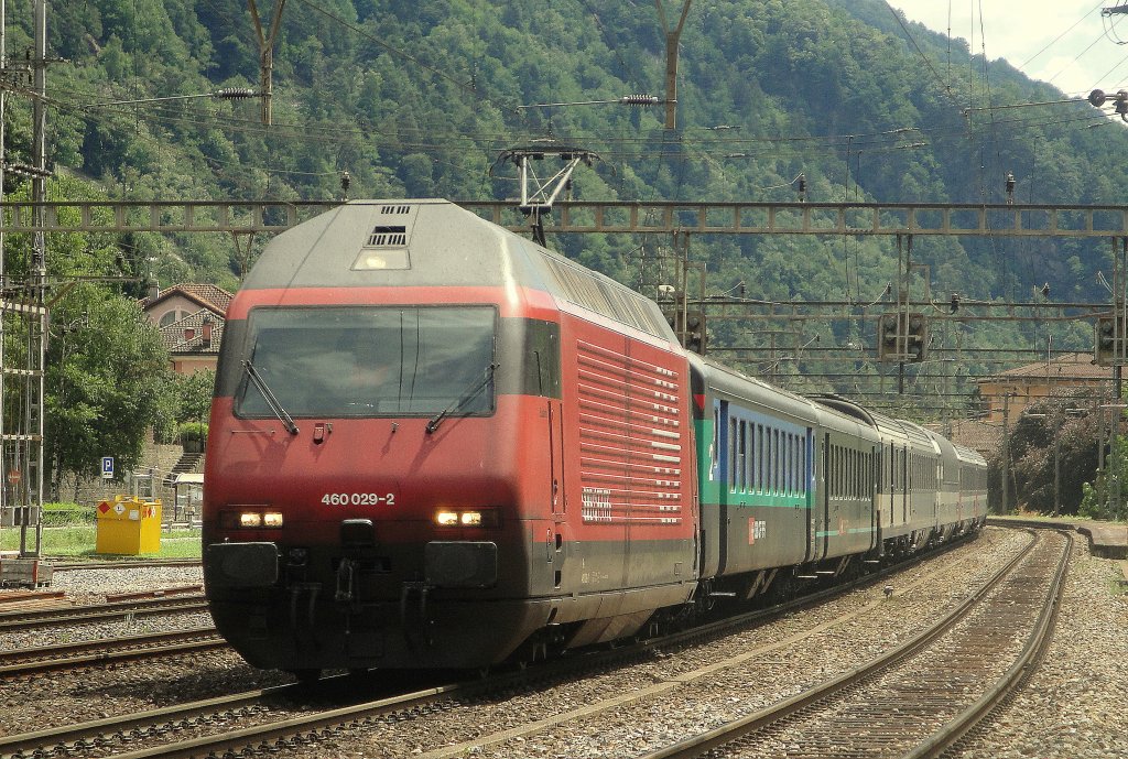 Die Re 460 029-2 "Eulach" durchfährt am 15.07.11 mit einem verstärkten IR den Bahnhof Lavorgo.