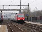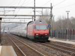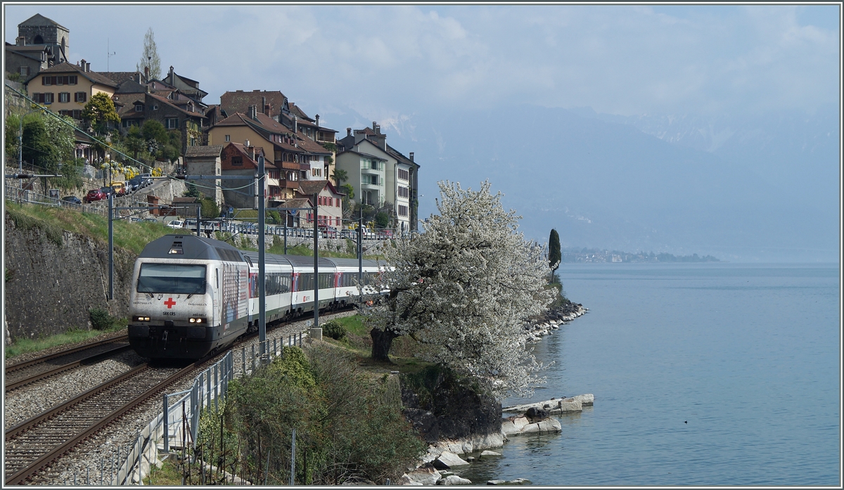 Die SBB Re 460 041-7 "SRK CRS redcross.ch" mit dem IR 1722 von Brig nach Genève Aéroport bei St-Saphorin.