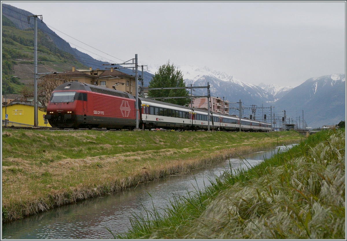 Die Re 460 085-4 mit dem IR 1726 am Kanal bei Saxon.