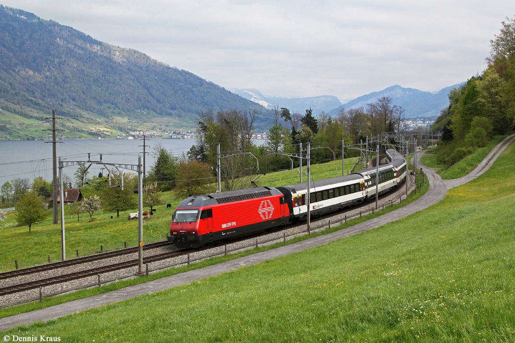Re 460 077 mit einem IR am 19.04.2014 bei Immensee.