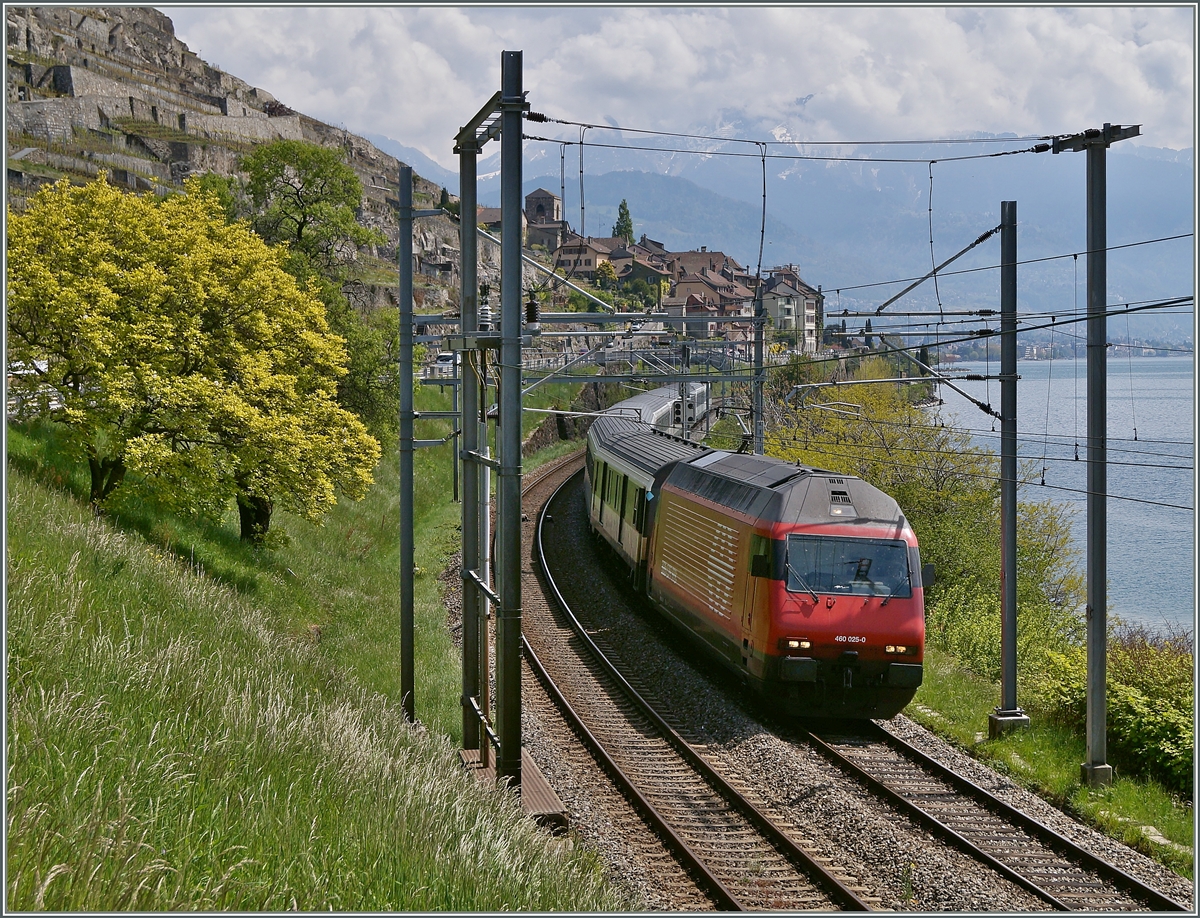 Die SBB Re 460 025-0 mit dem IR 1424 von Brig nach Genève Aéroport bei Rivaz.