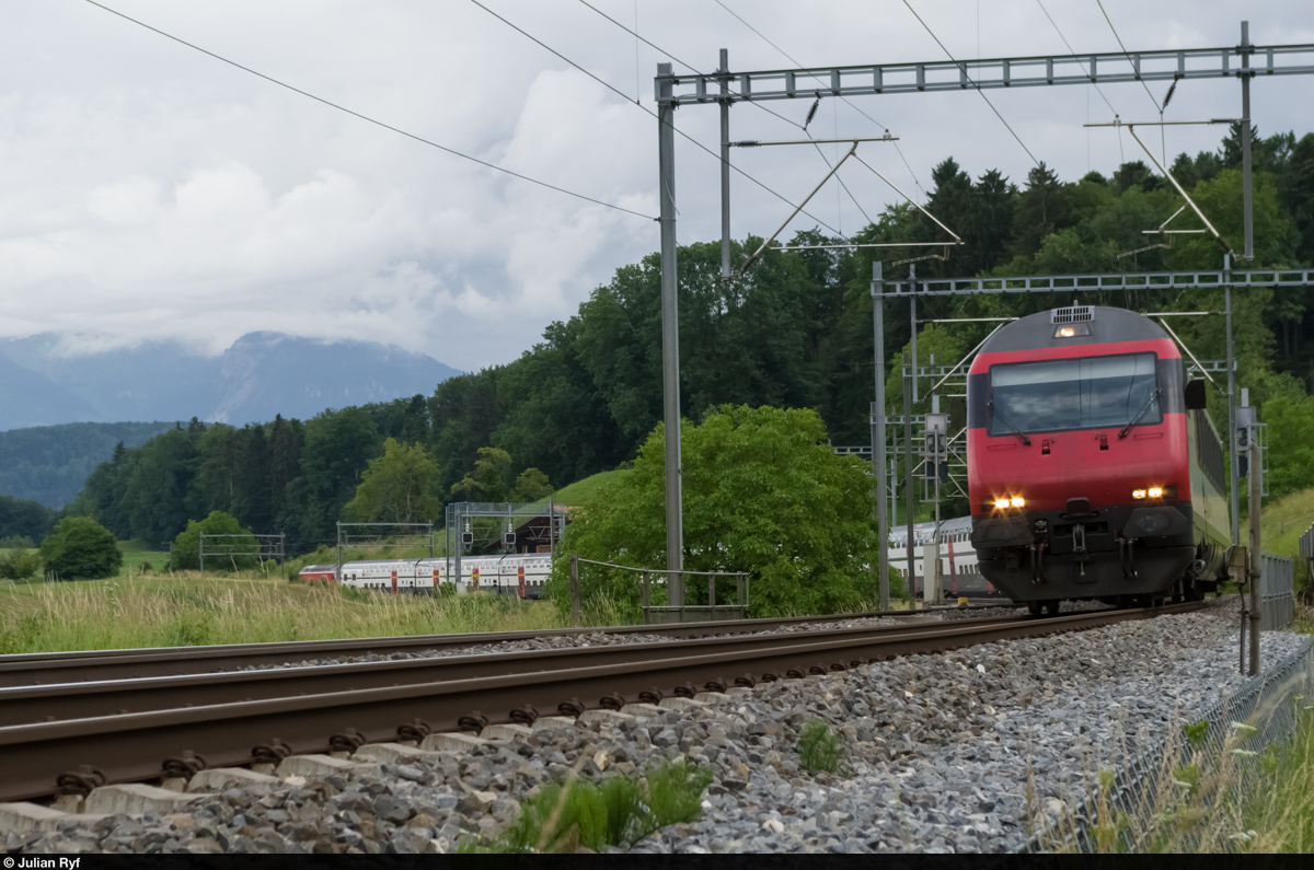 IC 829 Brig-Romanshorn fährt am 14. Juni 2015 durch die ehemalige Haltestelle Kumm am Thunersee.