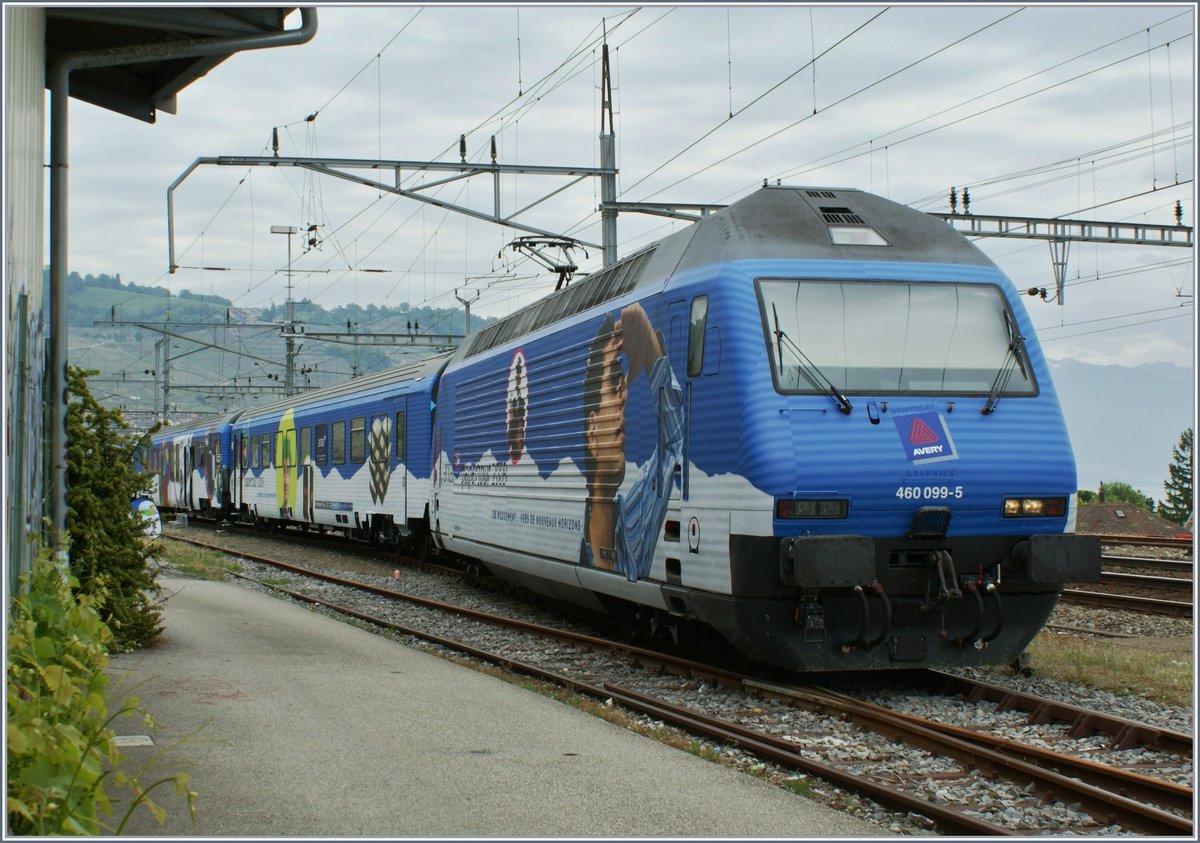 Die wohl kurzlebigste Werbe Lok aller Zeiten: Die SBB 460 099-5 "antalis papertour 2009" zeigt sich (und ihren ganzen Werbezug) am 11. Mai 2009 in Cully.