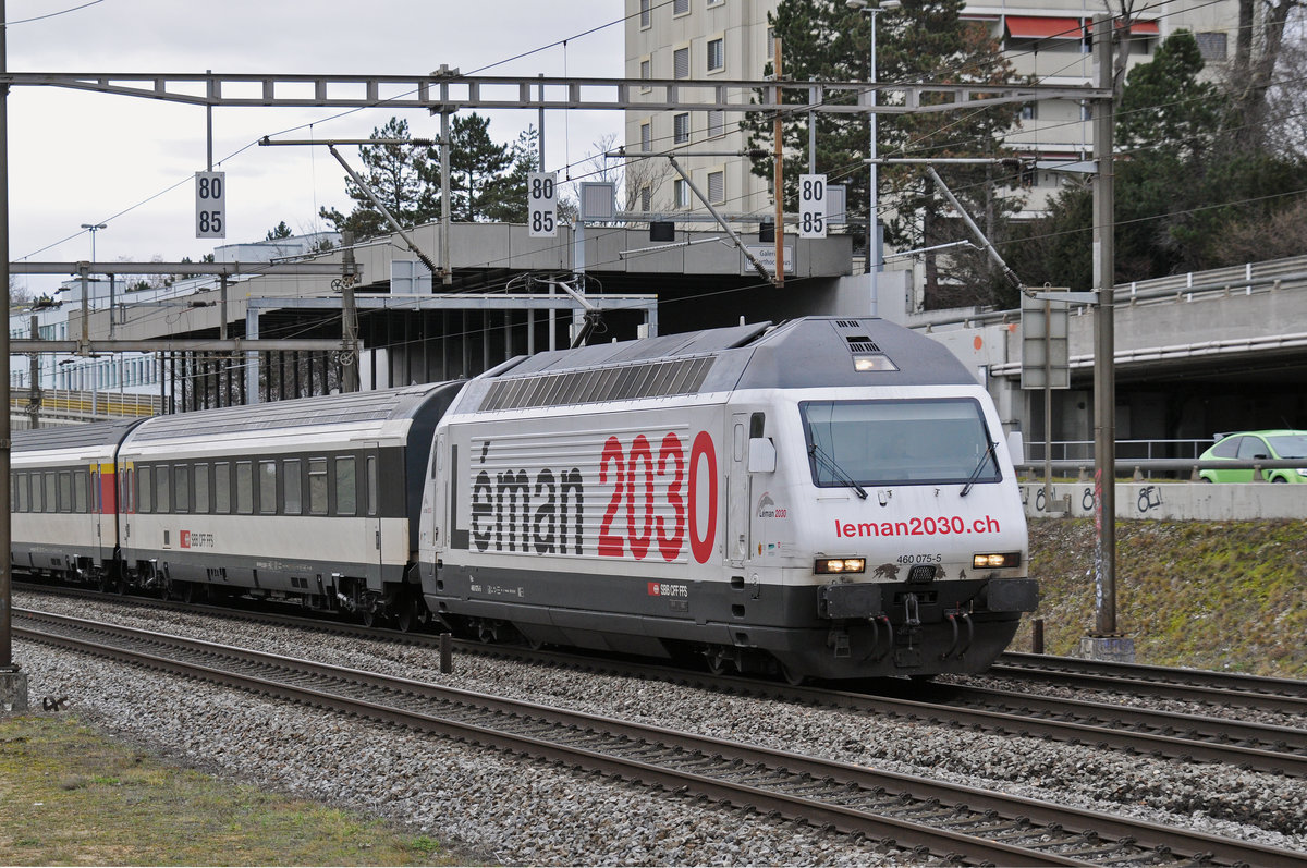 Re 460 075-5, mit der Léman 2030 Werbung, fährt Richtung Bahnhof Muttenz. Die Aufnahme stammt vom 28.12.2017.