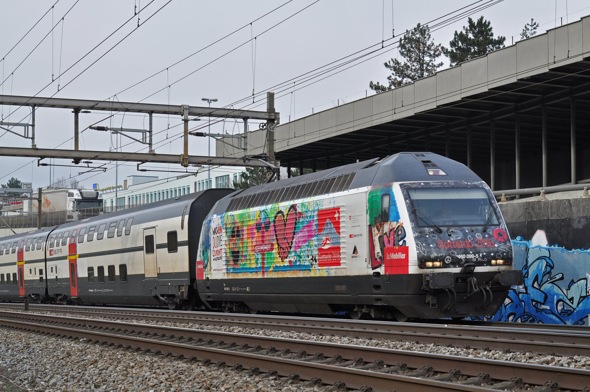 Re 460 099-5, mit der Mobiliar/Gottadro 2016 Werbung, fährt Richtung Bahnhof Muttenz. Die Aufnahme stammt vom 05.02.2018.