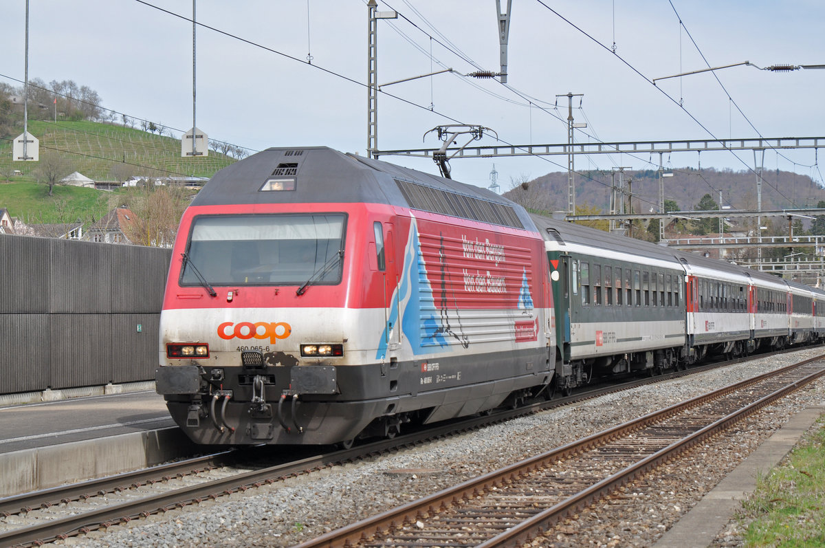 Re 460 065-6, mit der COOP Werbung, durchfährt den Bahnhof Gelterkinden. Die Aufnahme stammt vom 14.04.2018.