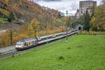 Re 460 019-3 ist mit einem speziellen Leermaterialzug von Zürich nach Basel unterwegs, um von dort aus als Sonderzug weiter nach Bure-Casernes zu fahren. Aufgenommen bei Schinznach-Dorf AG am 19.11.2022.