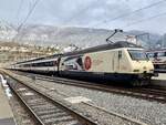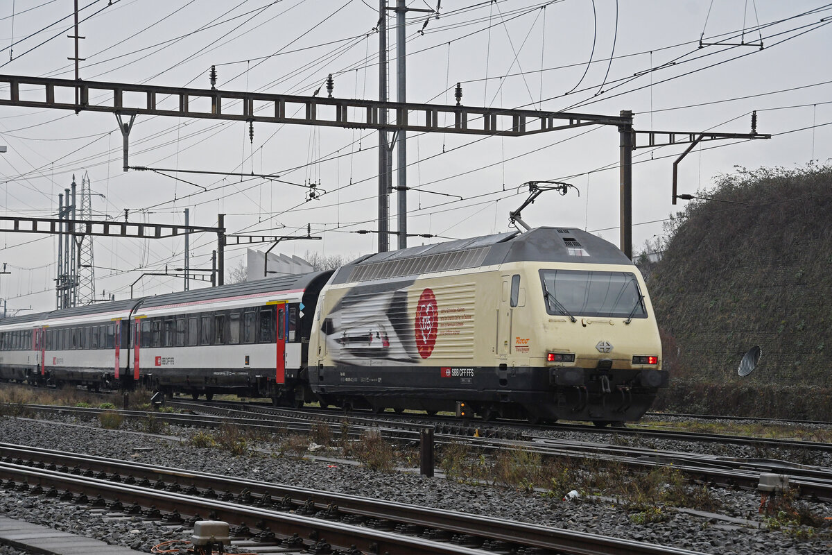 Re 460 019-3  175 Jahre Schweizer Eisenbahnen  durchfährt am 05.01.2024 den Bahnhof Pratteln.