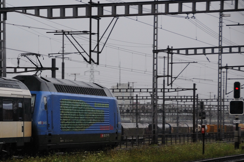 Es sollte nur noch dicker kommen... Die Regen- und Windintensität nahm minütlich zu. 460 071-4 "Vetro Suisse" jagt entlang des Muttenzer Rangierbahnhof ins graue Nichts. Sie wirbt für das Recyclingsystem der Schweiz. (10.08.09).