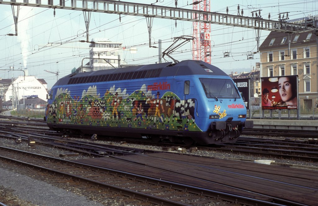 Den 26.Mai 2019 war noch trüb wann 460 075 mit "Leman 2030" Werbung in Brugg AG ein Halt einlegt.