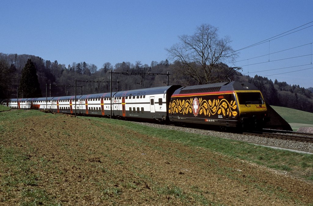 Sissach - 18. März 2025 : Re 460 046 "Polmengo" am IR 2467 von Basel SBB nach Luzern. Werbelok "Le Métier avec la plus belle vue du monde" = der Beruf mit der schönste Aussicht der Welt. Link zum Video : https://www.youtube.com/watch?v=WZIVF4CIHrU&t=5s