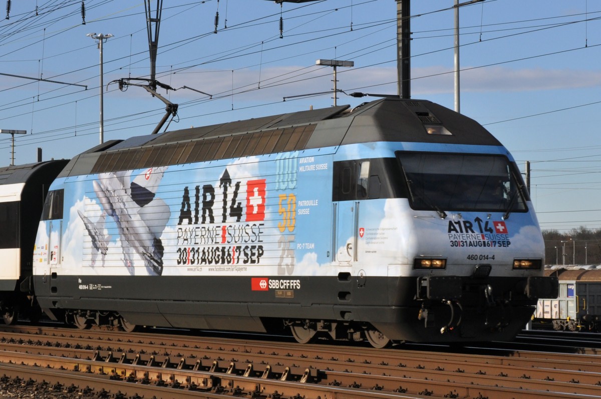 Re 460 014-4 mit der Vollwerbung für Air 14 in Payern durchfährt den Bahnhof Muttenz. Die Aufnahme stammt vom 17.01.2014.
