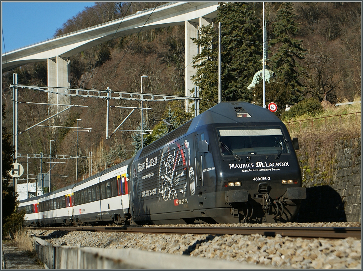 Re 460 076-3 mit dem IR 1421 von Genève nach Brig kurz vor Villenneuve bei Kilomerer 28.