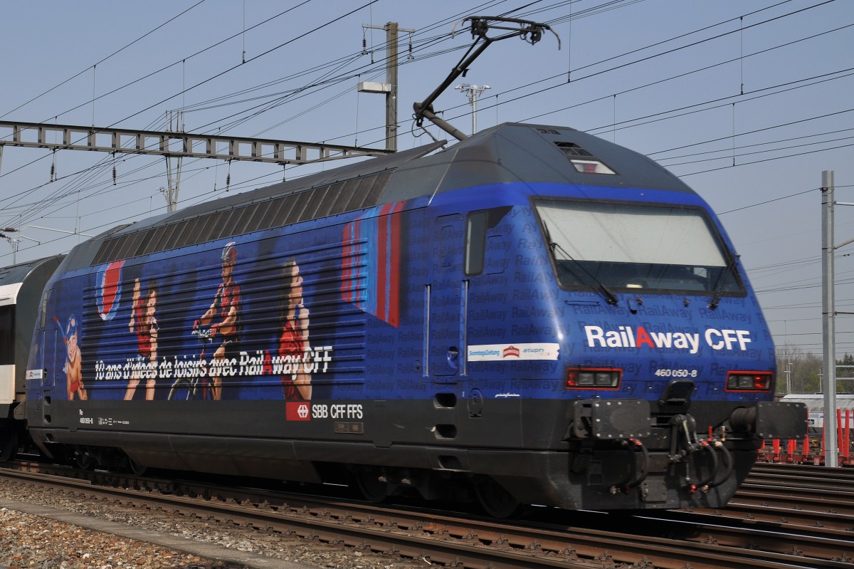 Re 460 050-8 mit der Rail a Way Werbung durchfährt den Bahnhof Muttenz. Die Aufnahme stammt vom 31.03.2014.