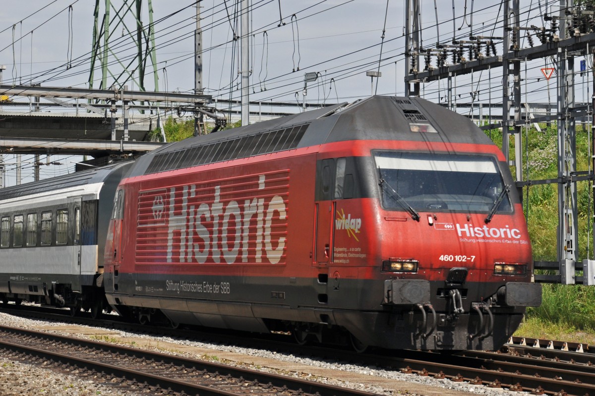 Re 460 102-7 mit der Historic Werbung durchfährt den Bahnhof Muttenz.