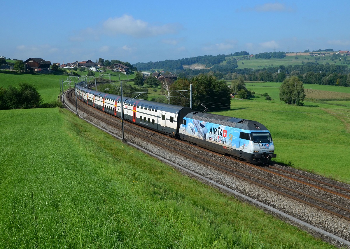 Re 460 014 mit einem IR nach Zürich-Flughafen am 02.09.2014 bei Honau.
