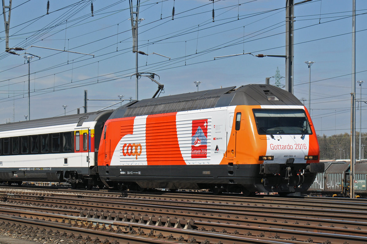 Re 460 085-4 mit der COOP/Gottardo 2016 Werbung, durchfährt den Bahnhof Muttenz. Die Aufnahme stammt vom 11.04.2016.