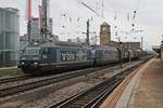 Doppeltraktion, mit den BLS Loks 465 016-4 und 465 002-4, durchfahren den Bahnhof Pratteln.